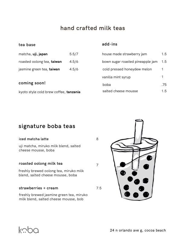 Unique, delicious, cozy atmosphere. The oolong boba is the best I've ever had by far. Love the pure ingredients! The japanese ice is unique and hydrating. Staff is warm & friendly. This is the place you want to come to and hang out on the patio (that has a ton of butterflies!) Thank you Daniel for being a creative genius and serving the community in this way. Koko and Koba are our favorite places in Florida by a long shot!!