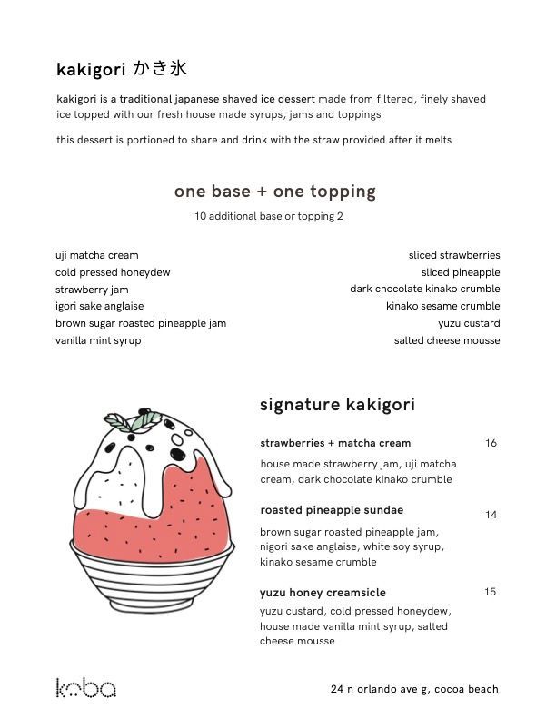 Unique, delicious, cozy atmosphere. The oolong boba is the best I've ever had by far. Love the pure ingredients! The japanese ice is unique and hydrating. Staff is warm & friendly. This is the place you want to come to and hang out on the patio (that has a ton of butterflies!) Thank you Daniel for being a creative genius and serving the community in this way. Koko and Koba are our favorite places in Florida by a long shot!!